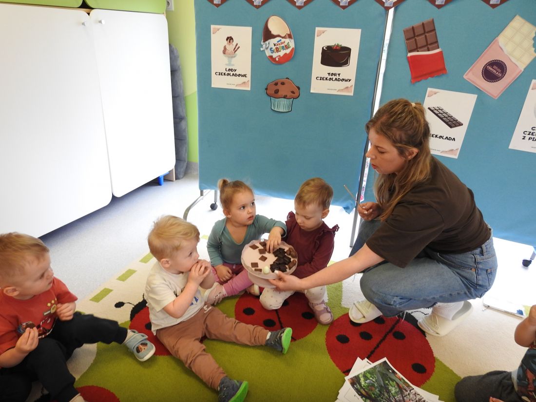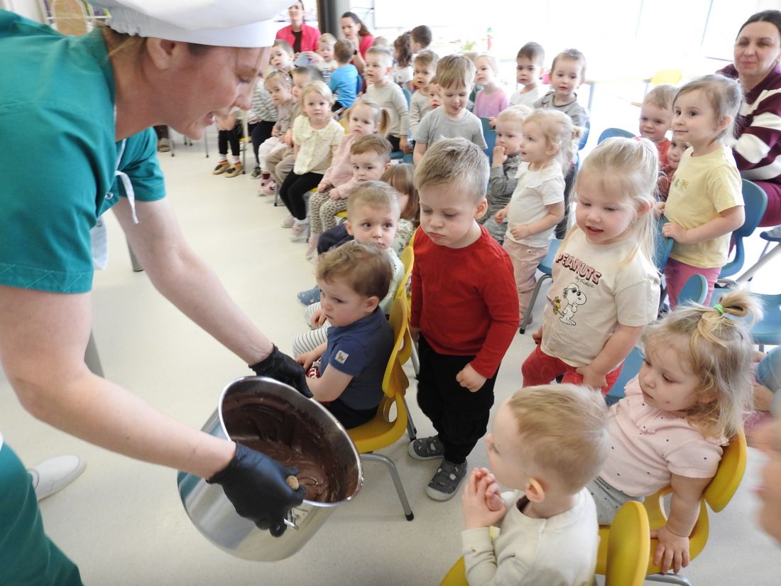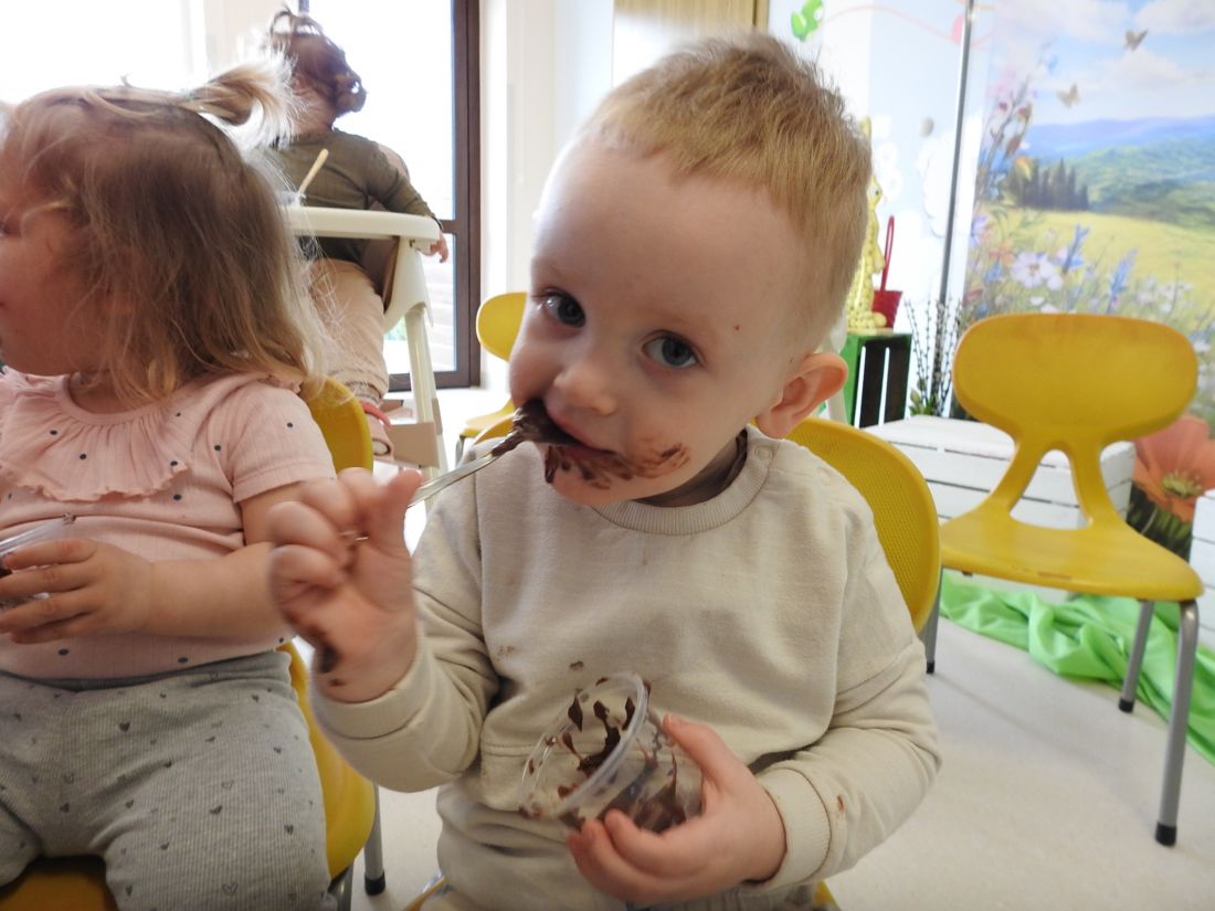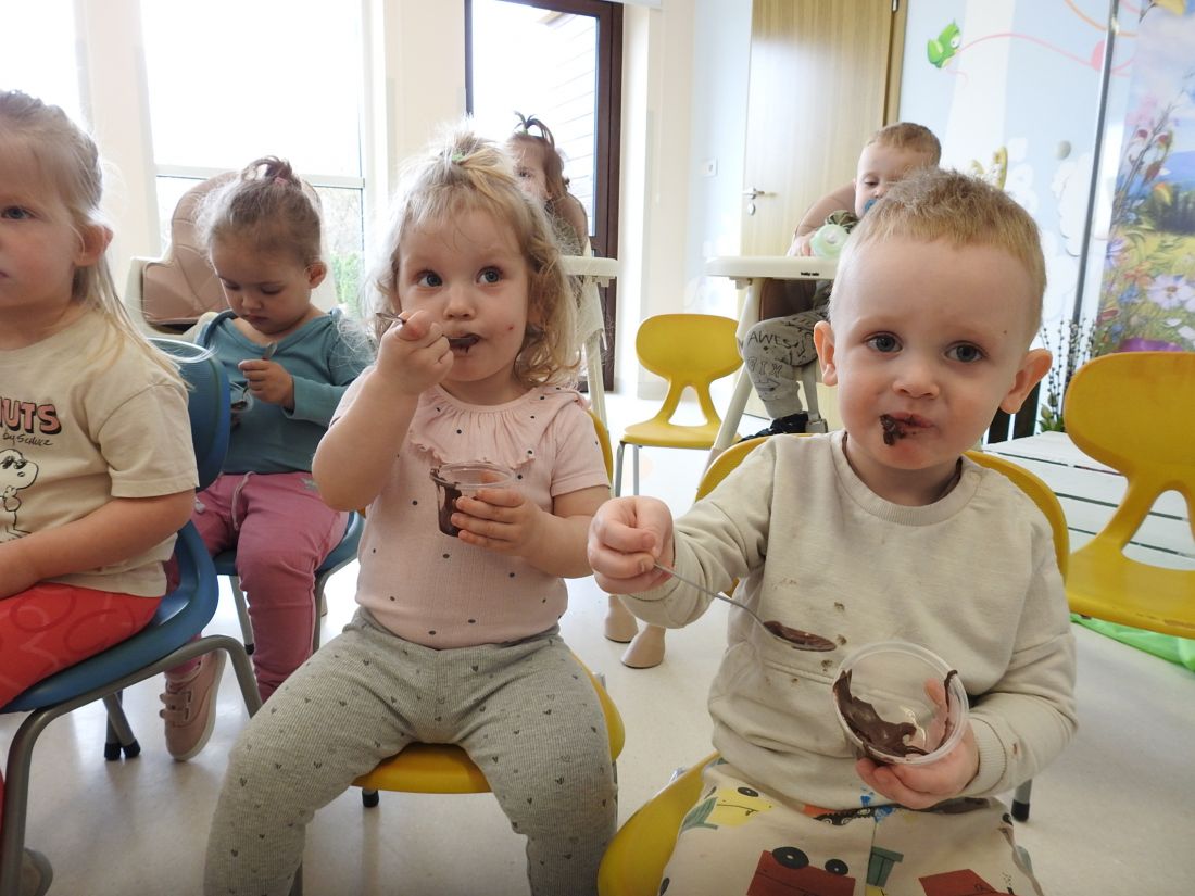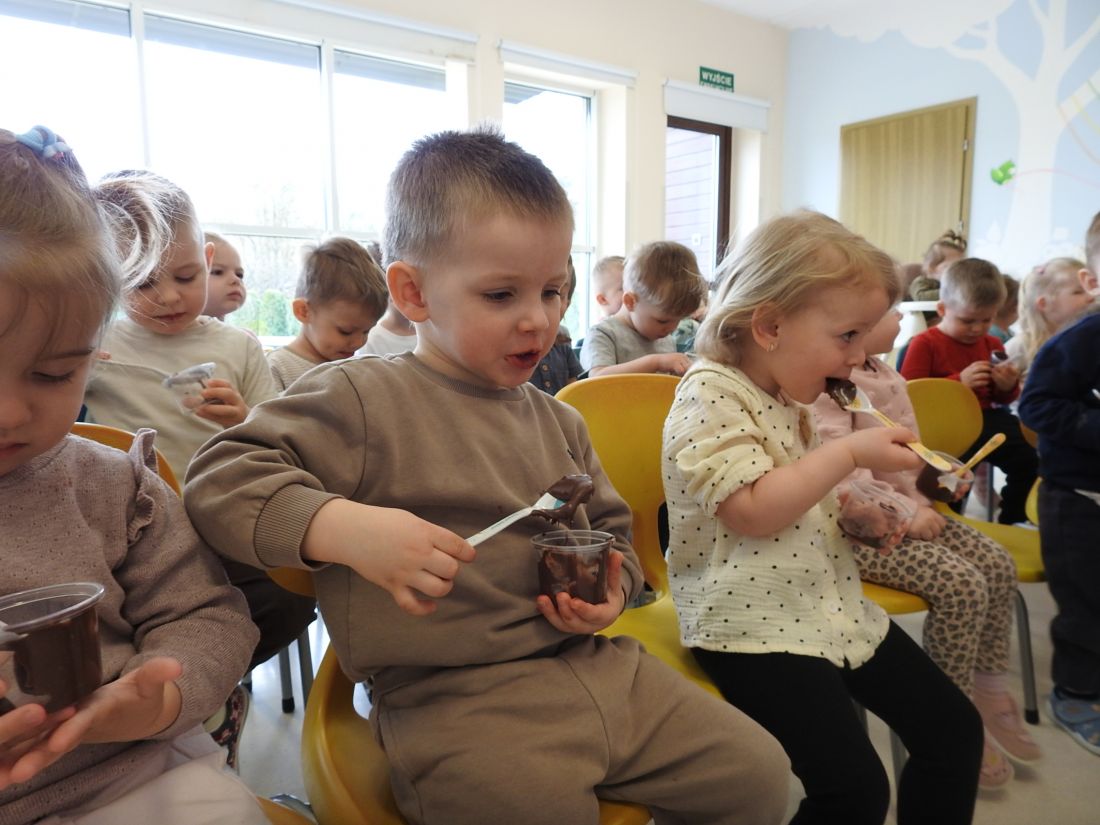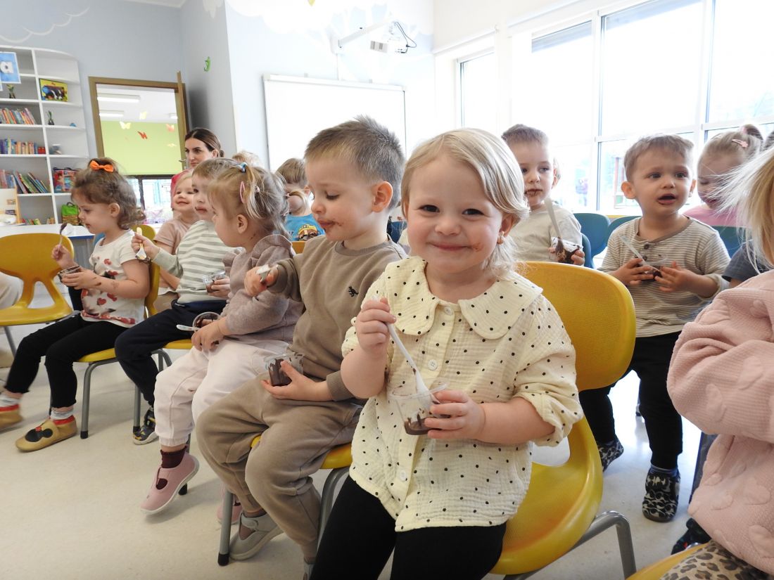 W naszym żłobku odbył się wyjątkowy i bardzo słodki Dzień Czekolady! Tego dnia dzieci miały okazję spróbować pysznych przysmaków, ale również dowiedzieć się, jak powstaje czekolada. Podczas specjalnie przygotowanego pokazu przez nasze Panie kucharki, maluchy zobaczyły jak powstaje ten przysmak. Największą radość sprawiła dzieciom część praktyczna- wspólna degustacja. Było dużo uśmiechu, radości i oczywiście wąsów! Dzień Czekolady był nie tylko pyszną przygodą , ale także okazją do nauki poprzez zabawę i rozwijanie ciekawości świata.